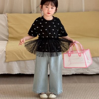 - [빠른수입] 블랙리본레이스티청바지셋